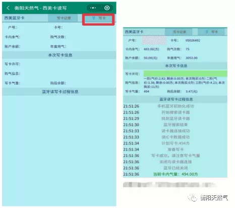 5、充值成功后將燃氣卡芯片朝下插入藍牙讀卡器中,點(diǎn)擊寫(xiě)卡可將儲存余額轉充成氣量。(如顯示寫(xiě)卡不成功,可再次點(diǎn)擊寫(xiě)卡重試,轉氣時(shí)不能關(guān)閉藍牙。)