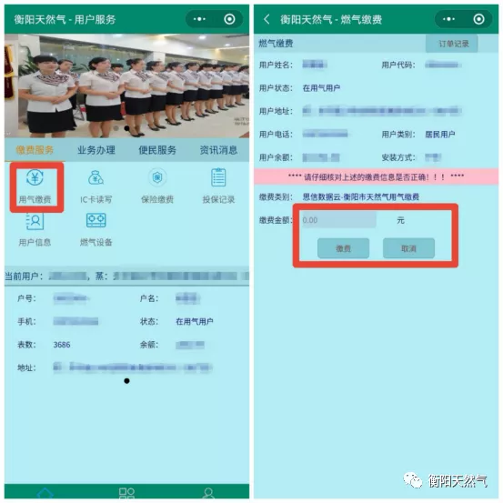 3、進(jìn)入主頁(yè)面點(diǎn)擊用氣繳費進(jìn)行氣費儲存。(普通機表直接繳費即充值成功)