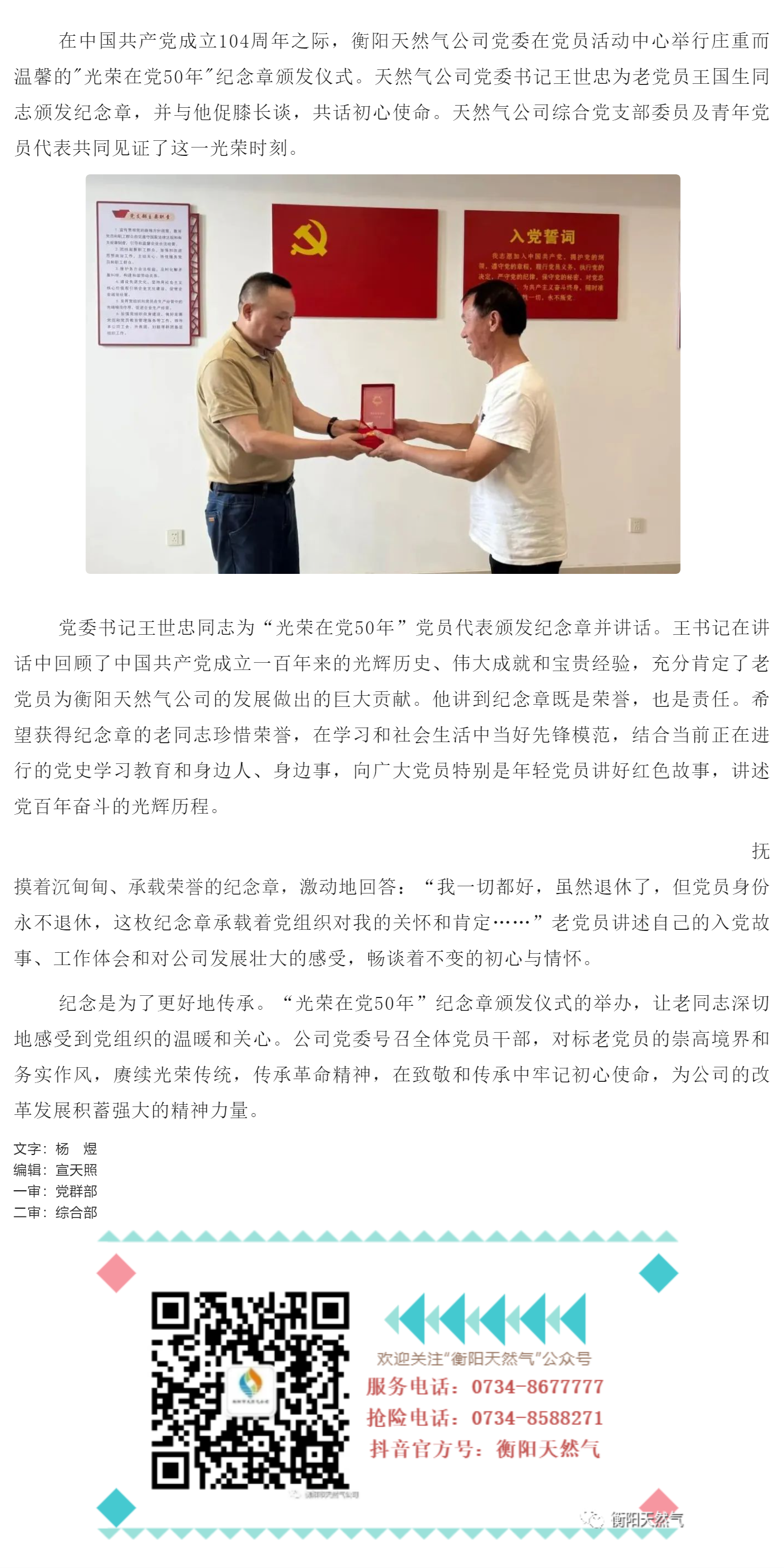 賡續紅色血脈+永葆黨員本色天然氣公司黨委舉行光榮在黨50年紀念章頒發(fā)儀式
