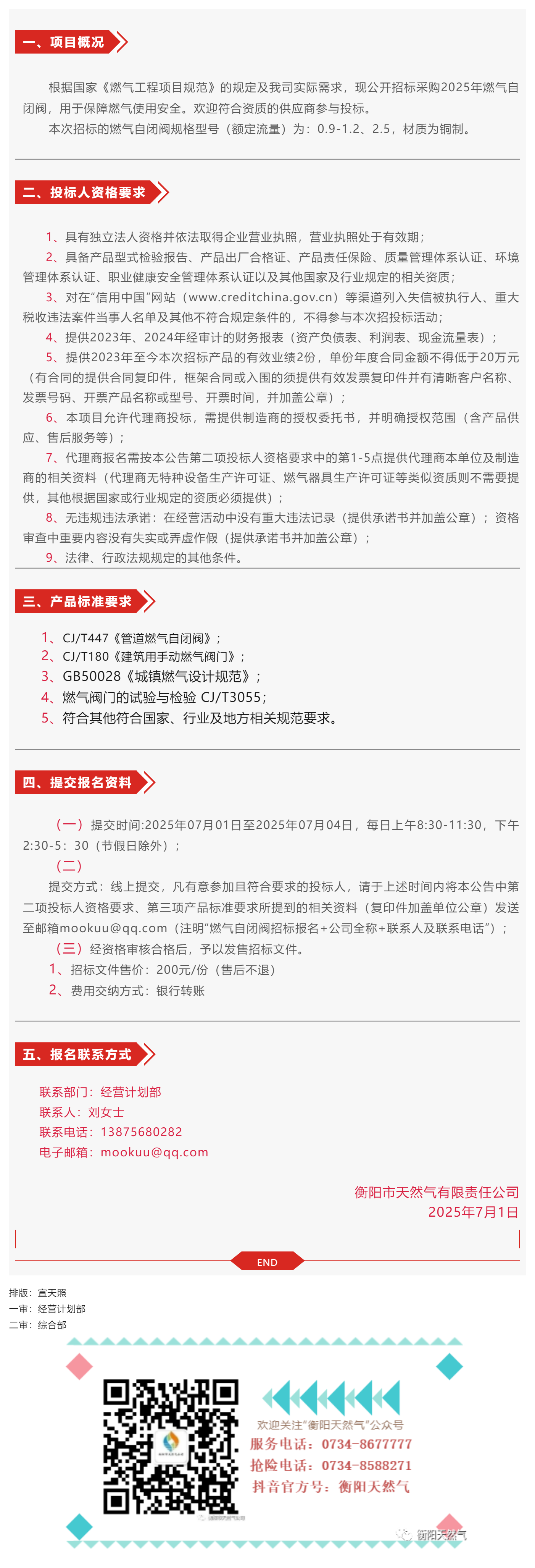 招標公告丨衡陽(yáng)市天然氣有限責任公司2025年燃氣自閉閥采購入圍招標公告